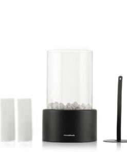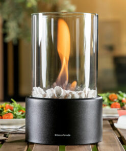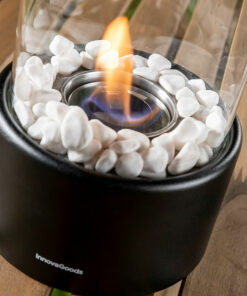 De InnovaGoods Heatfir bio-ethanol tafelhaard combineert stijl met functionaliteit. Het zwarte design met glazen kap past in elk interieur. Bovendien is de haard eenvoudig te verplaatsen dankzij het lichte gewicht. Met een brandtijd van ongeveer 60 minuten per 100 ml bio-ethanol geniet u urenlang van gezellige warmte. De InnovaGoods Heatfir bio-ethanol tafelhaard wordt compleet geleverd met decoratieve stenen en accessoires.